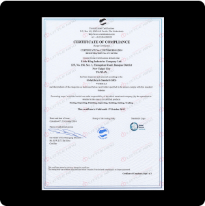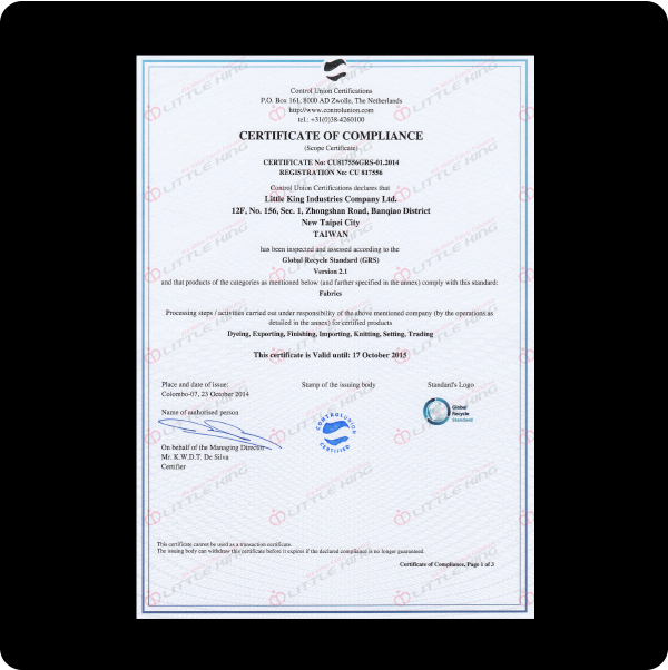 全球回收標準(Global Recycle Standard, GRS)係Control Union Certifications針對回收纖維所建立的品質管理認證。由取得原物料至供應鍊各階段的產銷過程,皆需符合GRS之認證標準,始能獲得此認證。立肯於 2 0 1 2 年取得GRS證書,證書相關的產品除了原料來源受規範外,生產過程包含廢水處理,以及勞工安全等,皆遵循嚴格的認證規範。在符合客戶需求的同時,立肯亦努力為環境永續發展盡心力。