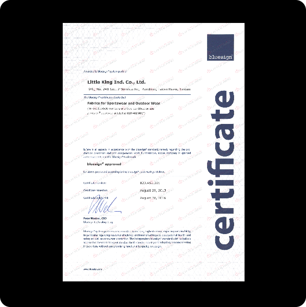 Bluesign為專門審核紡織業之認證系統,Bluesign認證廠商的生產過程,旨在降低生產對於環境之影響。立肯致力使生產的紡織品合乎環保規範,於 2 0 1 1 年通過Bluesign認證,使客戶安心採用以環保為主要訴求之產品。