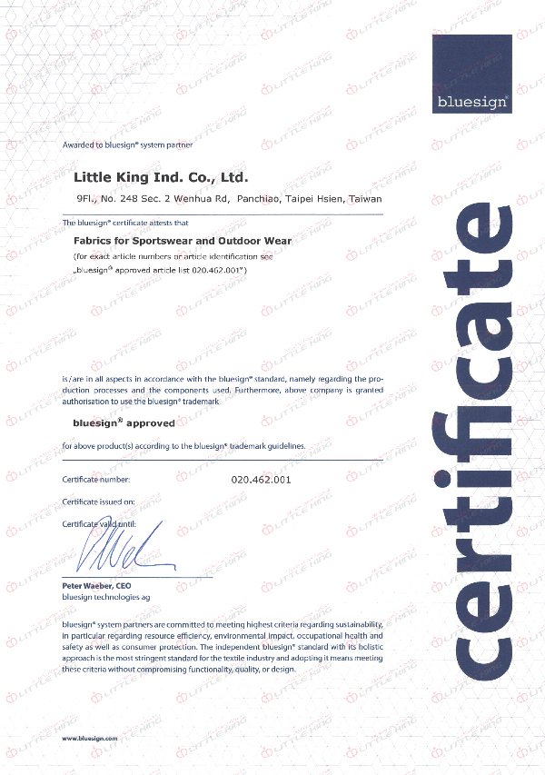Bluesign為專門審核紡織業之認證系統,Bluesign認證廠商的生產過程,旨在降低生產對於環境之影響。立肯致力使生產的紡織品合乎環保規範,於 2 0 1 1 年通過Bluesign認證,使客戶安心採用以環保為主要訴求之產品。
