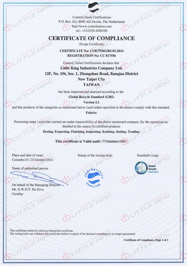 全球回收標準(Global Recycle Standard, GRS)係Control Union Certifications針對回收纖維所建立的品質管理認證。由取得原物料至供應鍊各階段的產銷過程,皆需符合GRS之認證標準,始能獲得此認證。立肯於 2 0 1 2 年取得GRS證書,證書相關的產品除了原料來源受規範外,生產過程包含廢水處理,以及勞工安全等,皆遵循嚴格的認證規範。在符合客戶需求的同時,立肯亦努力為環境永續發展盡心力。
